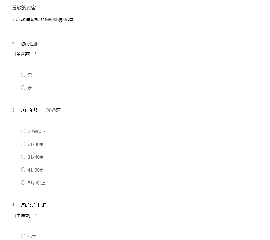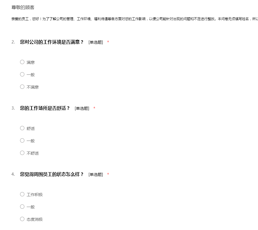 亲爱的员工,您好!为了了解公司的管理、工作环境、福利待遇等各方面对您的工作影响,以便公司能针对出现的问题和不足进行整改。本问卷无须填写姓名,所以请放心的如实填写。感谢您的配合!