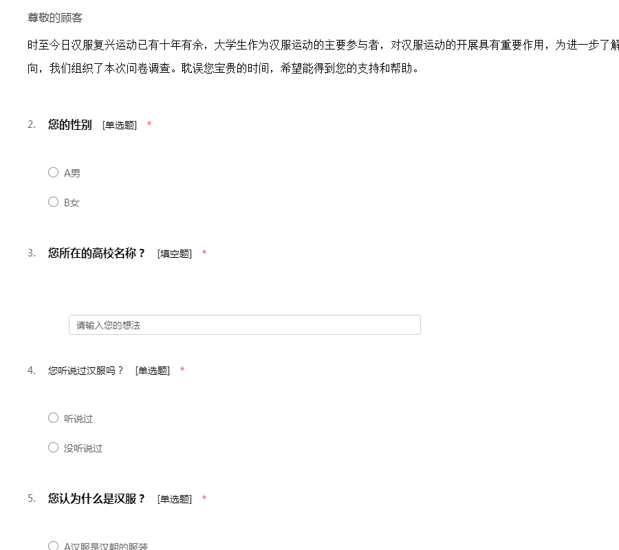 时至今日汉服复兴运动已有十年有余,大学生作为汉服运动的主要参与者,对汉服运动的开展具有重要作用,为进一步了解当代大学生关于汉服复兴的价值取向,我们组织了本次问卷调查。耽误您宝贵的时间,希望能得到您的支持和帮助。