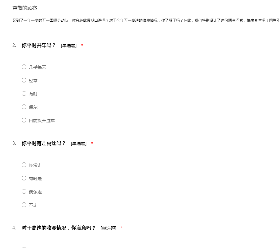 又到了一年一度的五一国际劳动节,你会趁此假期出游吗?对于今年五一高速的收费情况,你了解了吗?在此,我们特别设计了这份调查问卷,快来参与吧!问卷不记名,请认真填答!