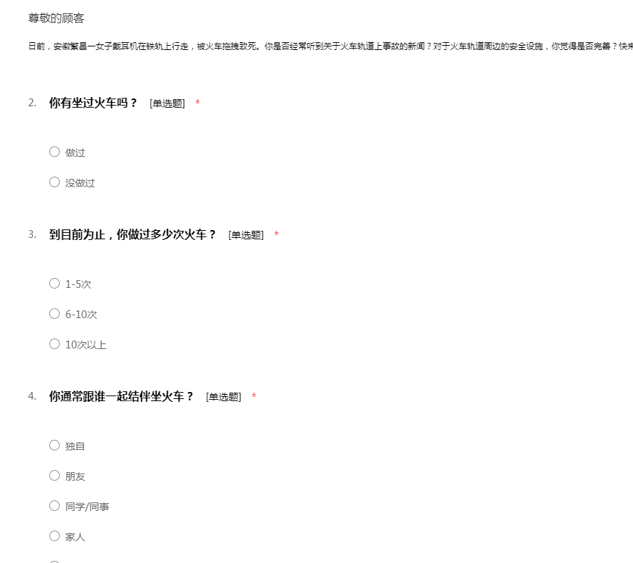 日前,安徽繁昌一女子戴耳机在铁轨上行走,被火车拖拽致死。你是否经常听到关于火车轨道上事故的新闻?对于火车轨道周边的安全设施,你觉得是否完善?快来参与我们此次的调查问卷,欢迎你前来参与!