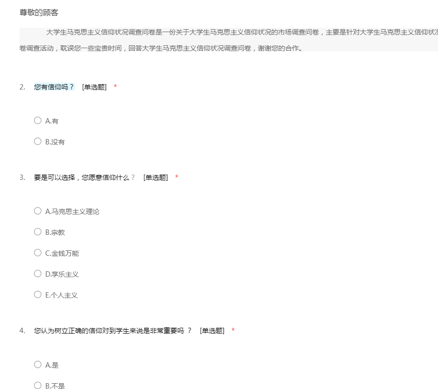 大学生马克思主义信仰状况调查问卷是一份关于大学生马克思主义信仰状况的市场调查问卷,主要是针对大学生马克思主义信仰状况方面问题进行的问卷调查,以此展开问卷调查活动,耽误您一些宝贵时间,回答大学生马克思主义信仰状况调查问卷,谢谢您的合作。