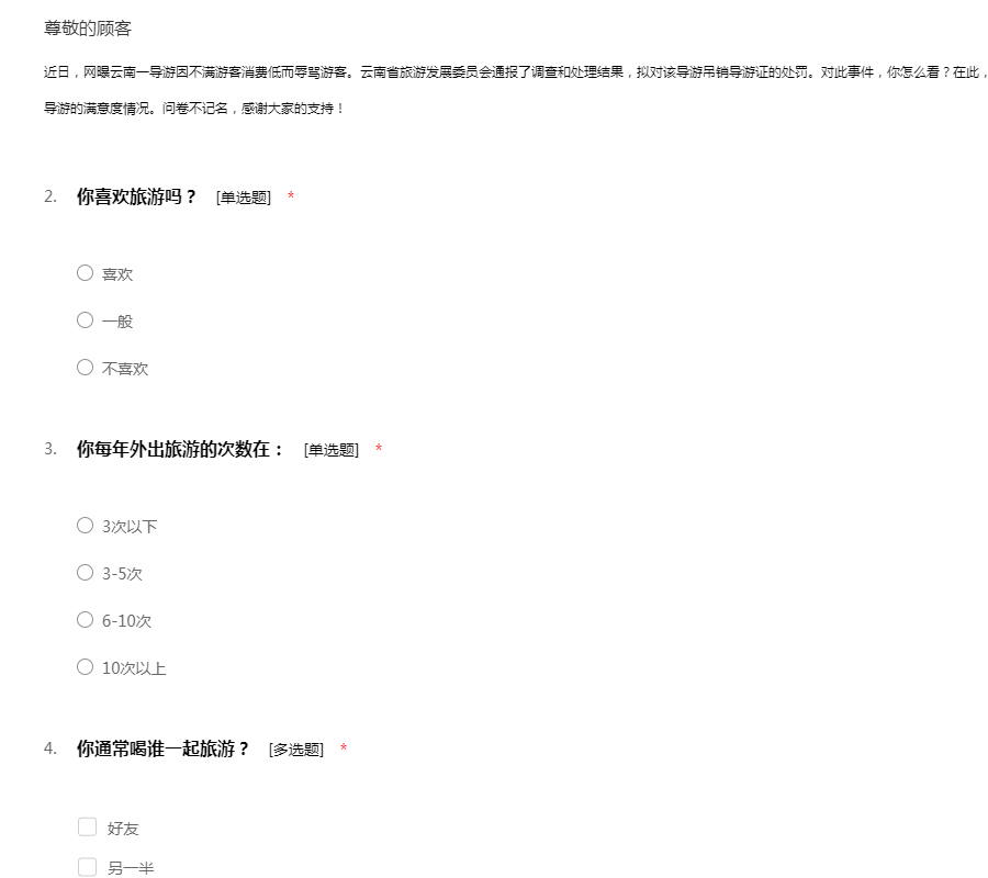 近日,网曝云南一导游因不满游客消费低而辱骂游客。云南省旅游发展委员会通报了调查和处理结果,拟对该导游吊销导游证的处罚。对此事件,你怎么看?在此,我们设计了这份调查问卷,希望能够了解大家对导游的满意度情况。问卷不记名,感谢大家的支持!