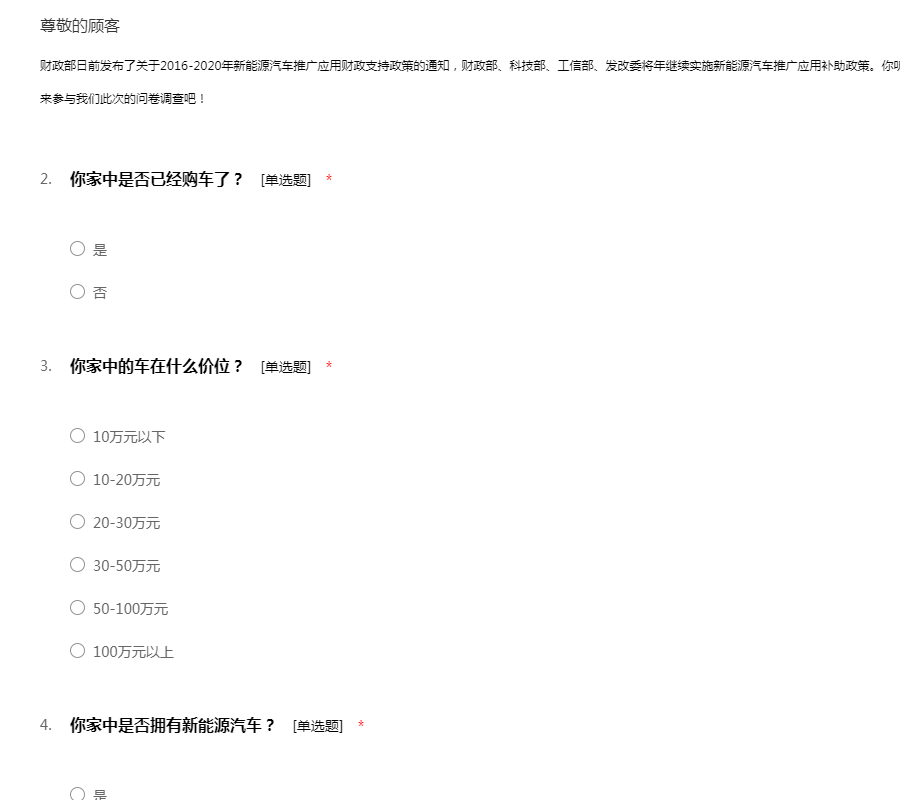 财政部日前发布了关于2016-2020年新能源汽车推广应用财政支持政策的通知,财政部、科技部、工信部、发改委将年继续实施新能源汽车推广应用补助政策。你听说过新能源汽车吗?你对新能源汽车怎么看?快来参与我们此次的问卷调查吧!