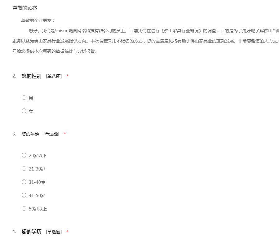 尊敬的企业朋友: 您好。我们是Suisun随商网络科技有限公司的员工。目前我们在进行《佛山家具行业概况》的调查,目的是为了更好地了解佛山当地家具行业的情况,以便更好地提供优质服务以及为佛山家具行业发展提供方向。本次调查采用不记名的方式,您的宝贵意见将有助于佛山家具业的蓬勃发展。非常感谢您的大力支持。如有需要,我们将通过微信平台公众号给您提供本次调研的数据统计与分析报告。