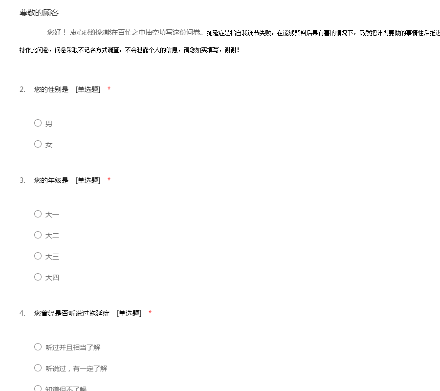 您好! 衷心感谢您能在百忙之中抽空填写这份问卷。拖延症是指自我调节失败,在能够预料后果有害的情况下,仍然把计划要做的事情往后推迟的一种行为。为了了解大学生拖延情况的现状,特作此问卷,问卷采取不记名方式调查,不会泄露个人的信息,请您如实填写,谢谢!