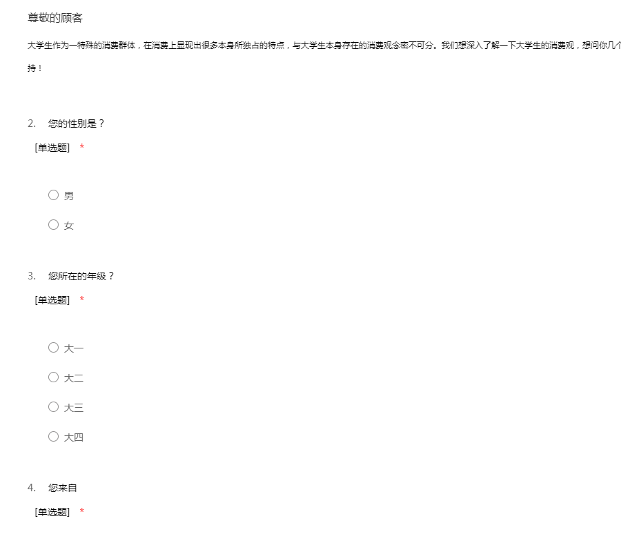 大学生作为一特殊的消费群体,在消费上显现出很多本身所独占的特点,与大学生本身存在的消费观念密不可分。我们想深入了解一下大学生的消费观,想问你几个相关问题,征求下您的意见。谢谢你的协助与支持!