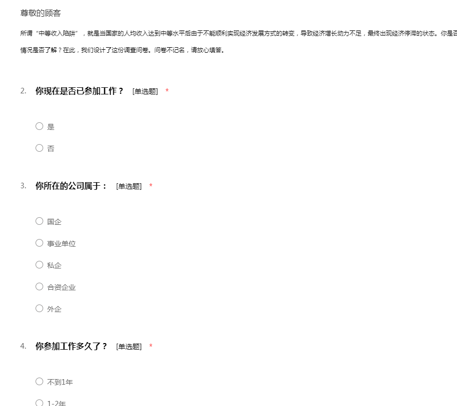 所谓“中等收入陷阱”,就是当国家的人均收入达到中等水平后由于不能顺利实现经济发展方式的转变,导致经济增长动力不足,最终出现经济停滞的状态。你是否了解我国的经济发展情况?你对我国的经济发展情况是否了解?在此,我们设计了这份调查问卷。问卷不记名,请放心填答。