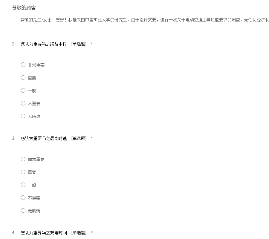 尊敬的先生/女士:您好!我是来自中国矿业大学的研究生,由于设计需要,进行一次关于电动交通工具功能要求的调查,无任何经济利益。衷心希望能得到您的配合!