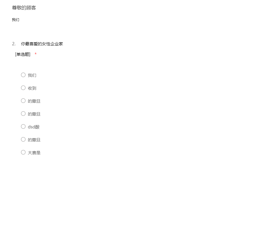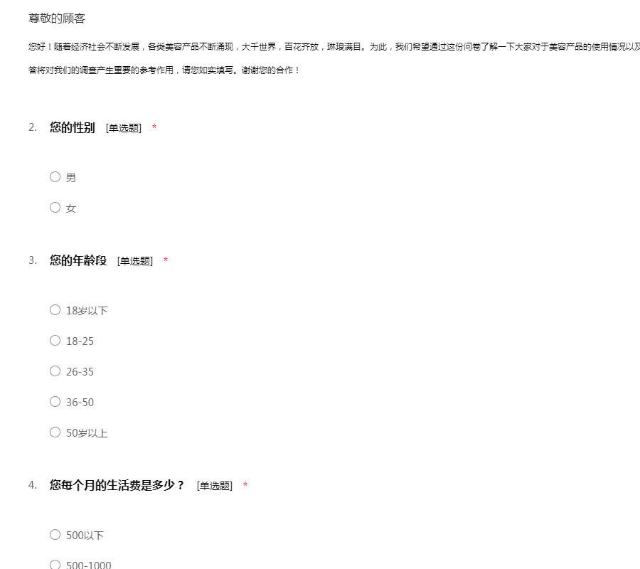您好!随着经济社会不断发展,各类美容产品不断涌现,大千世界,百花齐放,琳琅满目。为此,我们希望通过这份问卷了解一下大家对于美容产品的使用情况以及美容市场的情况。此问卷采用匿名形式,您的回答将对我们的调查产生重要的参考作用,请您如实填写。谢谢您的合作!