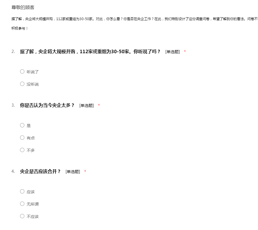 据了解,央企将大规模并购,112家或重组为30-50家。对此,你怎么看?你是否在央企工作?在此,我们特别设计了这份调查问卷,希望了解到你的看法。问卷不记名,调查结果仅用于市场调查之用。感谢你的积极参与!