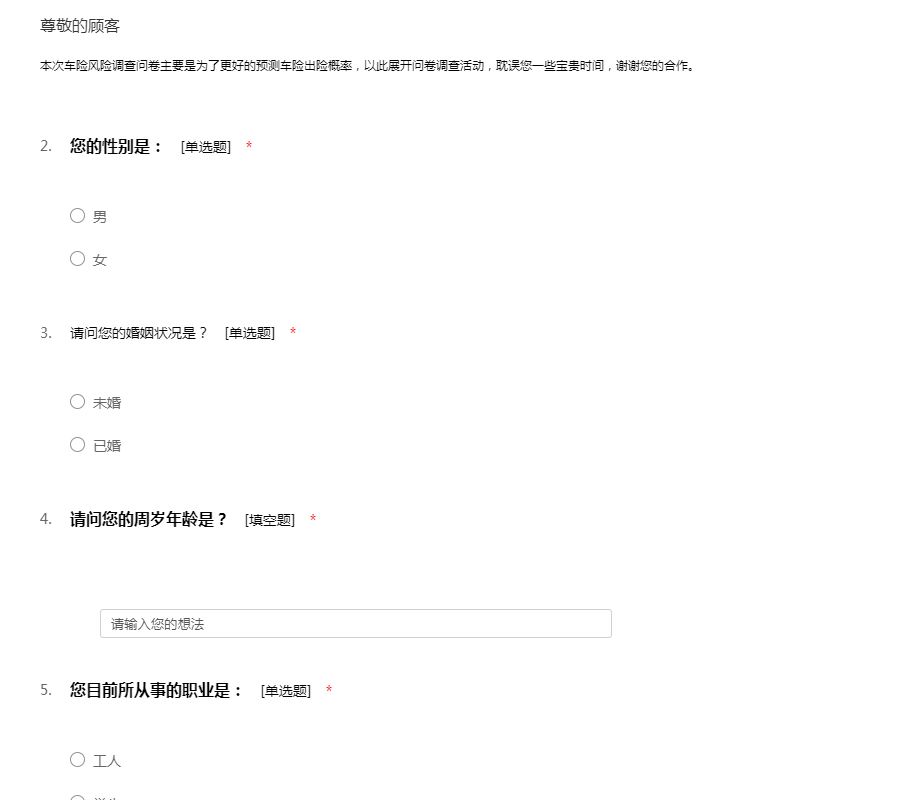 本次车险风险调查问卷主要是为了更好的预测车险出险概率,以此展开问卷调查活动,耽误您一些宝贵时间,谢谢您的合作。