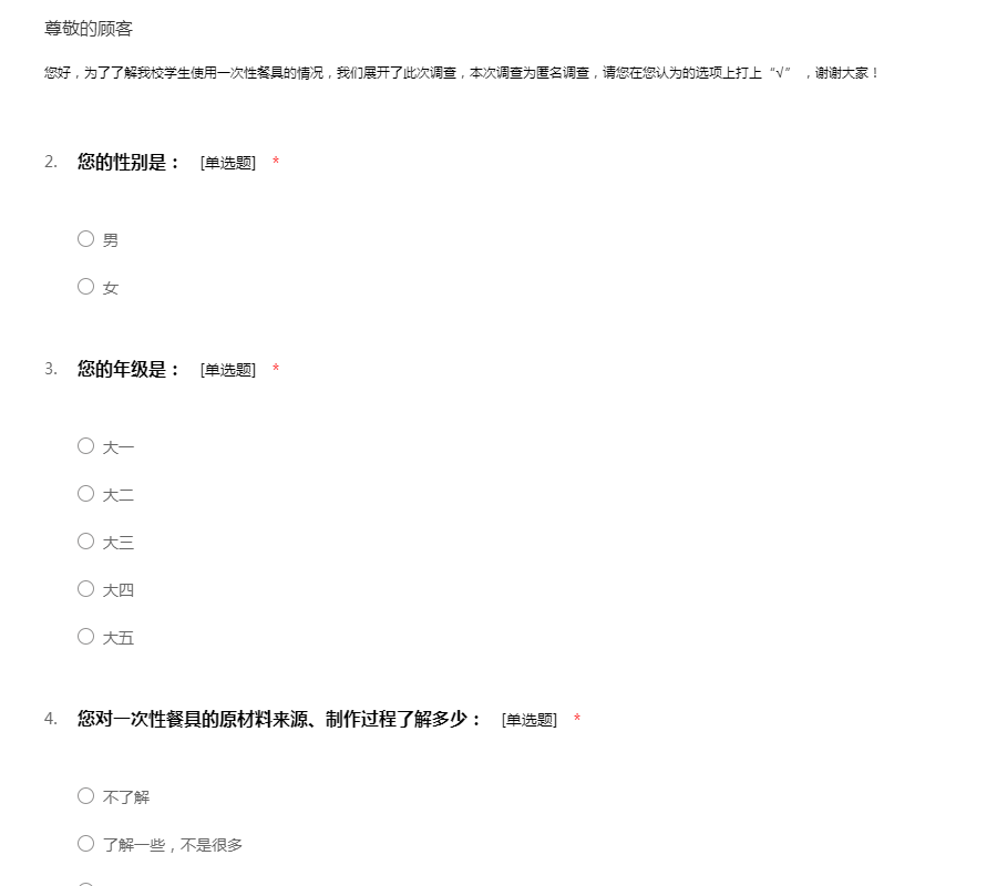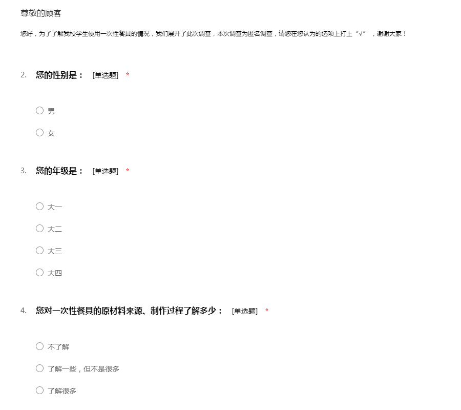 您好,为了了解我校学生使用一次性餐具的情况,我们展开了此次调查,本次调查为匿名调查,请您在您认为的选项上打上“√” ,谢谢大家!