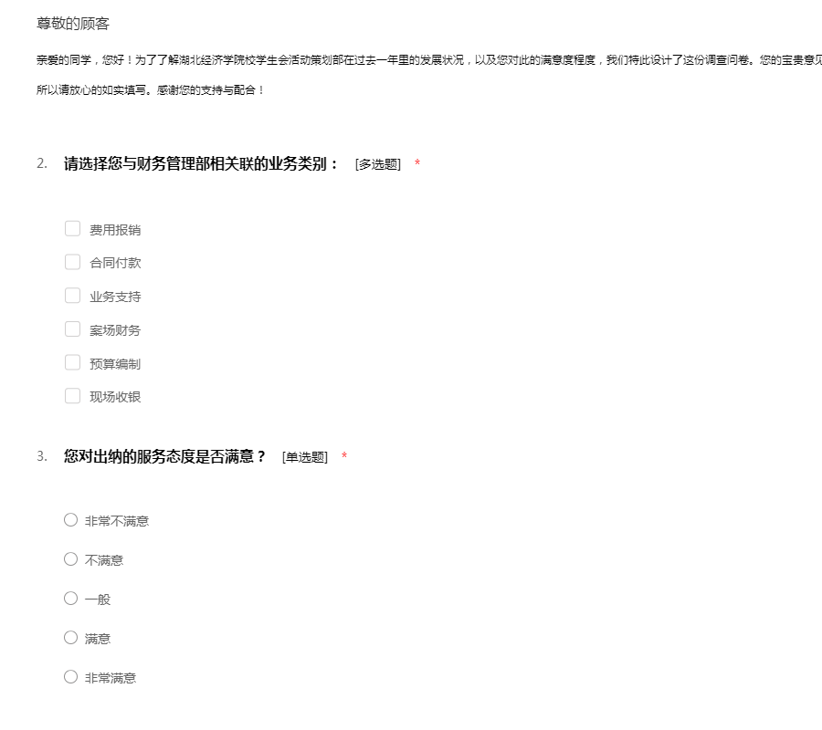 亲爱的同学,您好!为了了解湖北经济学院校学生会活动策划部在过去一年里的发展状况,以及您对此的满意度程度,我们特此设计了这份调查问卷。您的宝贵意见对我们非常重要,本问卷也是采用不记名方式,所以请放心的如实填写。感谢您的支持与配合!