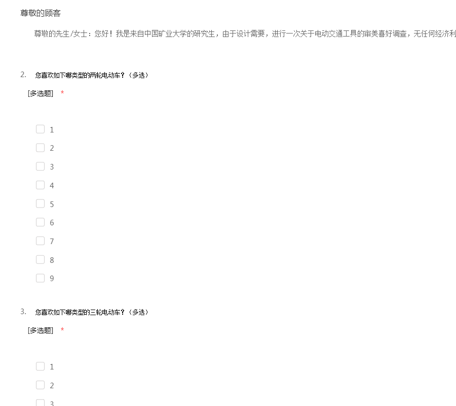 尊敬的先生/女士:您好!我是来自中国矿业大学的研究生,由于设计需要,进行一次关于电动交通工具的审美喜好调查,无任何经济利益。衷心希望能得到您的配合!