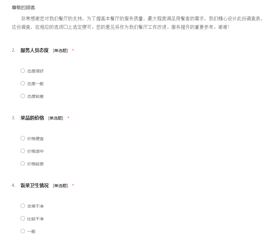非常感谢您对我们餐厅的支持,为了提高本餐厅的服务质量,最大程度满足用餐者的需求,我们精心设计此份调查表,请抽出您宝贵的时间协助我们完成这份调查,在相应的选项□上选定便可。您的意见将作为我们餐厅工作改进、服务提升的重要参考。谢谢!