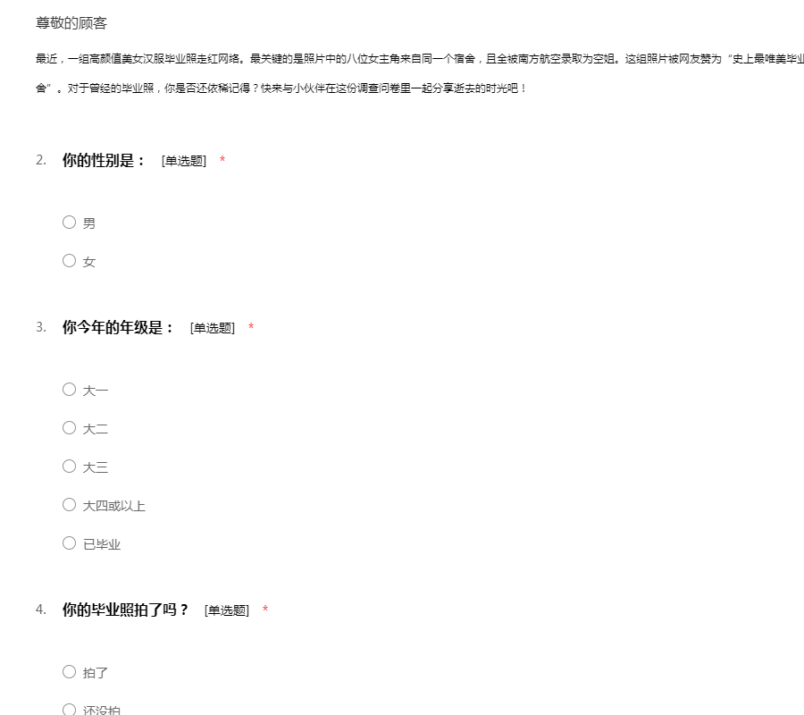 最近,一组高颜值美女汉服毕业照走红网络。最关键的是照片中的八位女主角来自同一个宿舍,且全被南方航空录取为空姐。这组照片被网友赞为“史上最唯美毕业照”,这个宿舍也被称为“史上最美学霸宿舍”。对于曾经的毕业照,你是否还依稀记得?快来与小伙伴在这份调查问卷里一起分享逝去的时光吧!