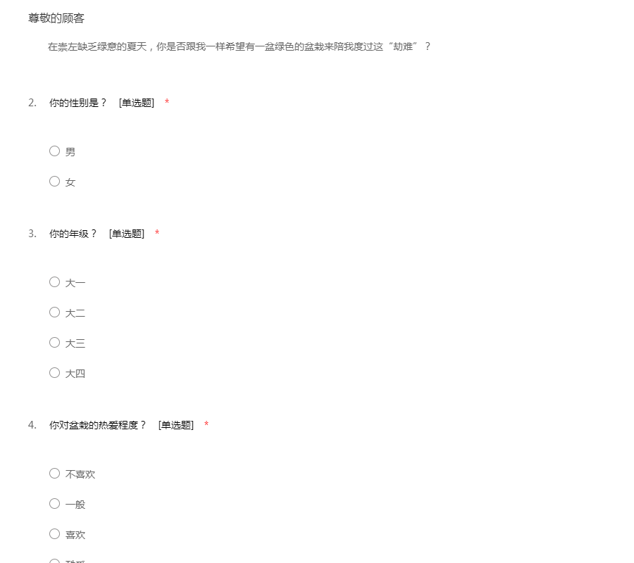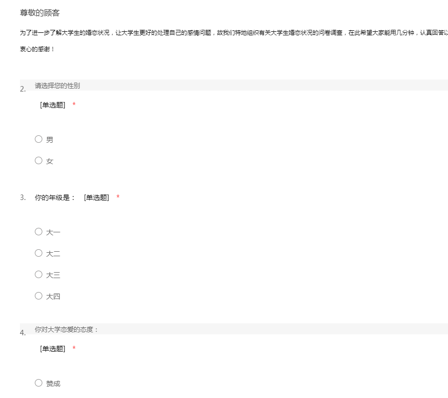 为了进一步了解大学生的婚恋状况,让大学生更好的处理自己的感情问题,故我们特地组织有关大学生婚恋状况的问卷调查,在此希望大家能用几分钟,认真回答以下问题,对您的帮助,我们小组全体人员表示最衷心的感谢!