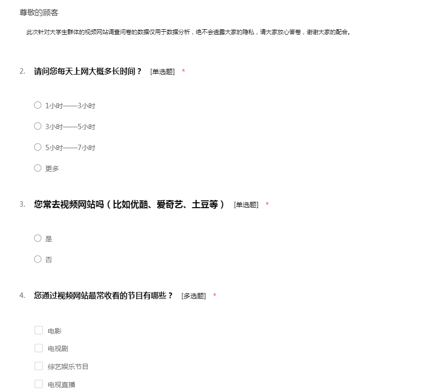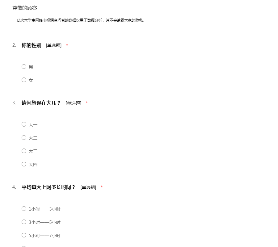 此次大学生网络电视调查问卷的数据仅用于数据分析,纯不会透露大家的隐私。