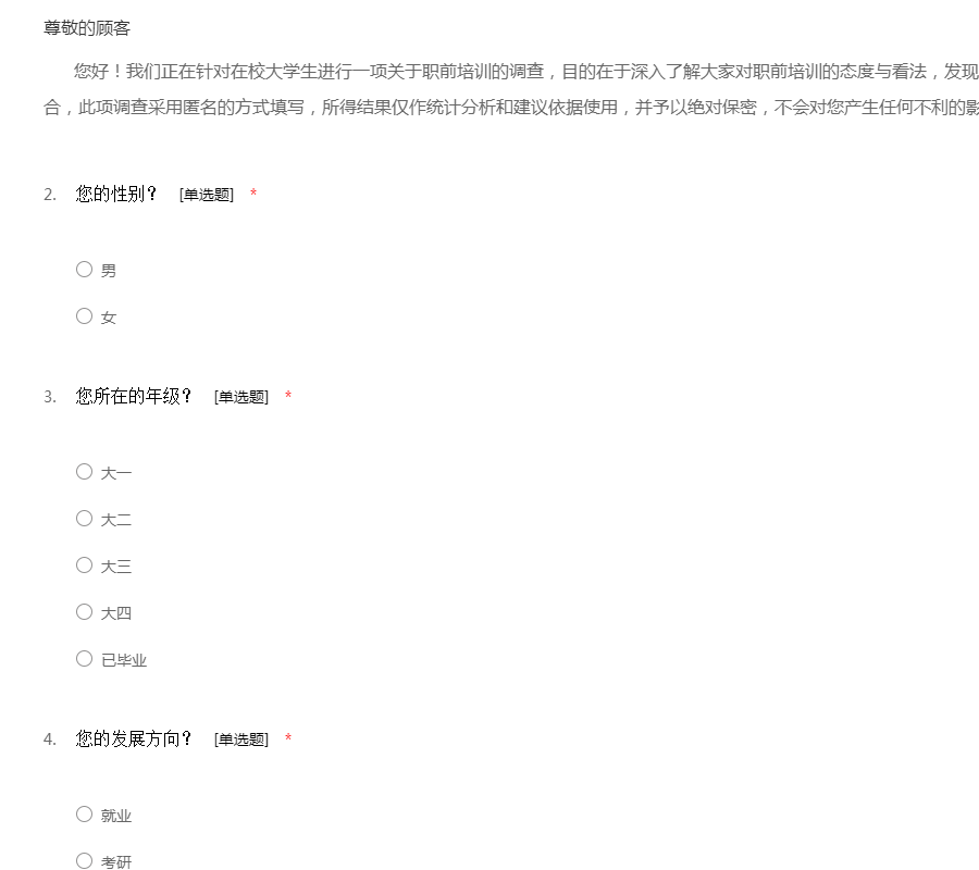 您好!我们正在针对在校大学生进行一项关于职前培训的调查,目的在于深入了解大家对职前培训的态度与看法,发现其中存在的问题。希望能得到您的配合,此项调查采用匿名的方式填写,所得结果仅作统计分析和建议依据使用,并予以绝对保密,不会对您产生任何不利的影响,请您放心填写。