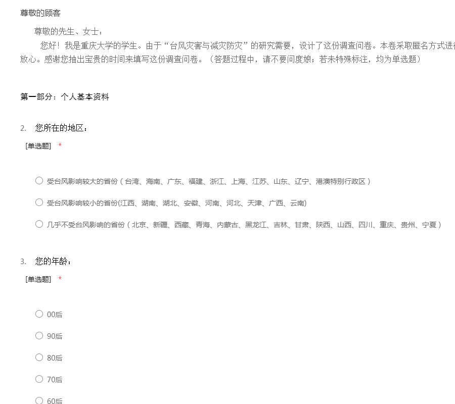 尊敬的先生、女士: 您好!我是重庆大学的学生。由于“台风灾害与减灾防灾”的研究需要,设计了这份调查问卷。本卷采取匿名方式进行,调查结果仅用于课题研究,请您放心。感谢您抽出宝贵的时间来填写这份调查问卷。(答题过程中,请不要问度娘;若未特殊标注,均为单选题)
