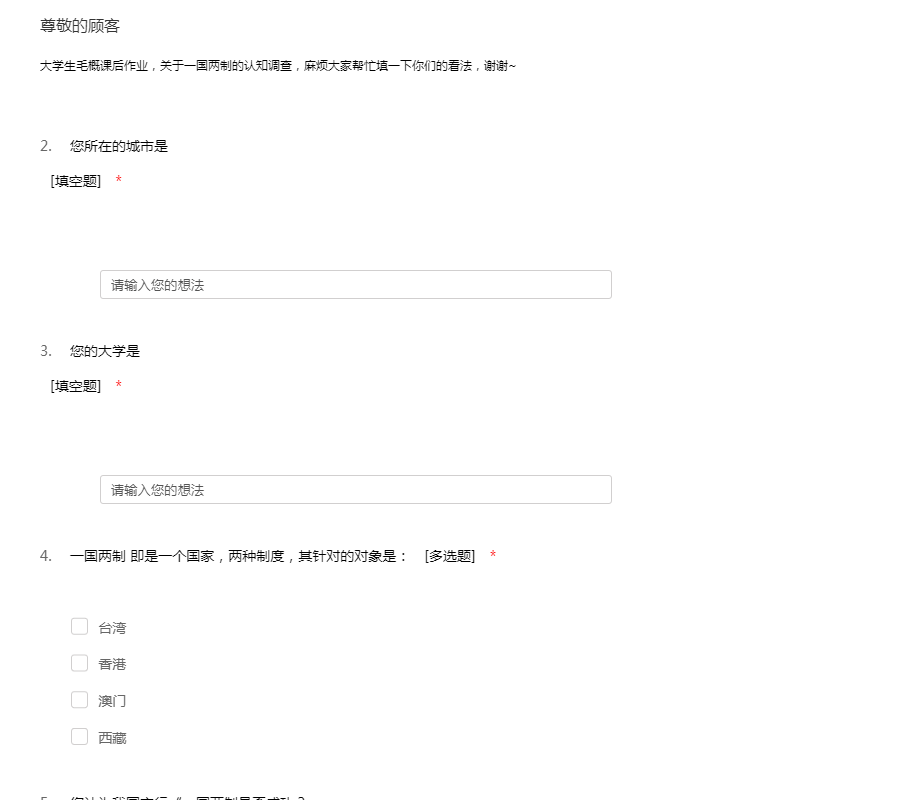 大学生毛概课后作业,关于一国两制的认知调查,麻烦大家帮忙填一下你们的看法,谢谢~