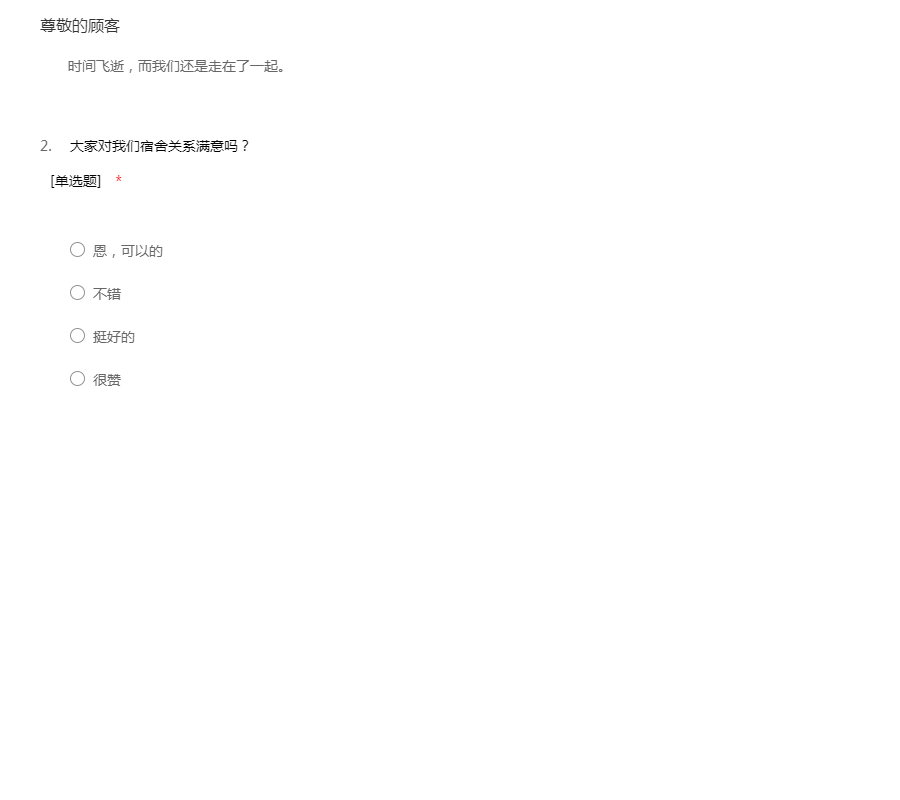 本问卷为不记名调查,评估内容后面的“非常满意”(100分)“满意”(80分)“一般”(60分)“不满意”(40分)“很不满意(20分)”的对应定义如下: