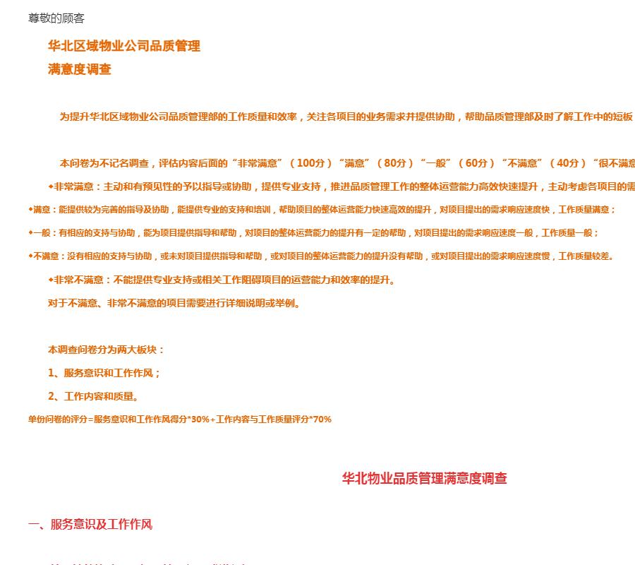 为提升华北区域物业公司品质管理部的工作质量和效率,关注各项目的业务需求并提供协助,帮助品质管理部及时了解工作中的短板,增强业务能力,请您参与此次调查!