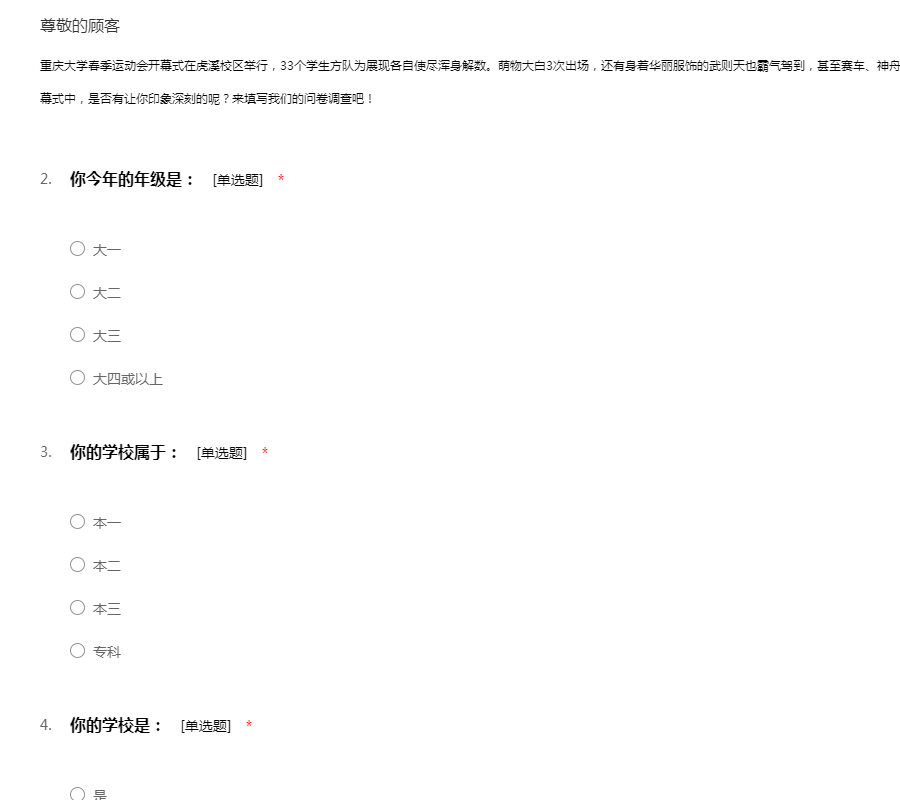 重庆大学春季运动会开幕式在虎溪校区举行,33个学生方队为展现各自使尽浑身解数。萌物大白3次出场,还有身着华丽服饰的武则天也霸气驾到,甚至赛车、神舟等炫酷高科技产物也来了。你们学校的运动会开幕式中,是否有让你印象深刻的呢?来填写我们的问卷调查吧!