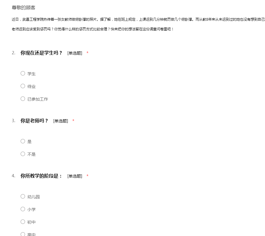 近日,武昌工程学院热传着一张女教师做俯卧撑的照片。据了解,她在班上规定,上课迟到几分钟就罚做几个俯卧撑。而从教8年来从未迟到过的她也没有想到自己迟到了,原因是她开车上班路上遇追尾。你觉得老师迟到应该受到惩罚吗?你觉得什么样的惩罚方式比较合理?快来把你的想法留在这份调查问卷里吧!