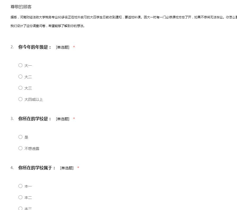 据悉,河南财经法政大学税务专业60多名正在校外实习的大四学生日前收到通知,要返校补课。因大一时有一门必修课校方忘了开,如果不修将无法毕业。你怎么看这件事?你是否有遇到过类似的事件?在此,我们设计了这份调查问卷,希望能够了解到你的想法。