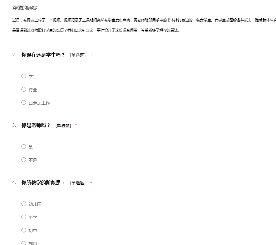 近日,有网友上传了一个视频。视频记录了上课期间突然有学生发出声响,男老师随即用手中的书本摔打身边的一名女学生。女学生试图躲避并反击,随后肢体冲突升级。据报道,事发地是信阳潢川彭店中学。你是否遇到过老师殴打学生的经历?我们此次针对这一事件设计了这份调查问卷,希望能够了解你的看法。