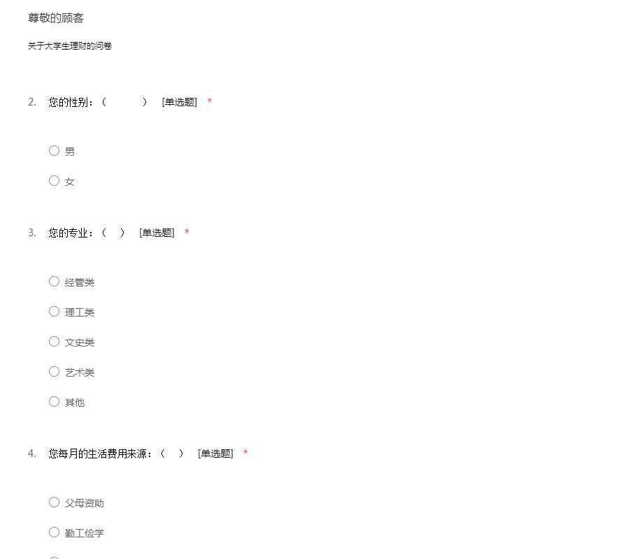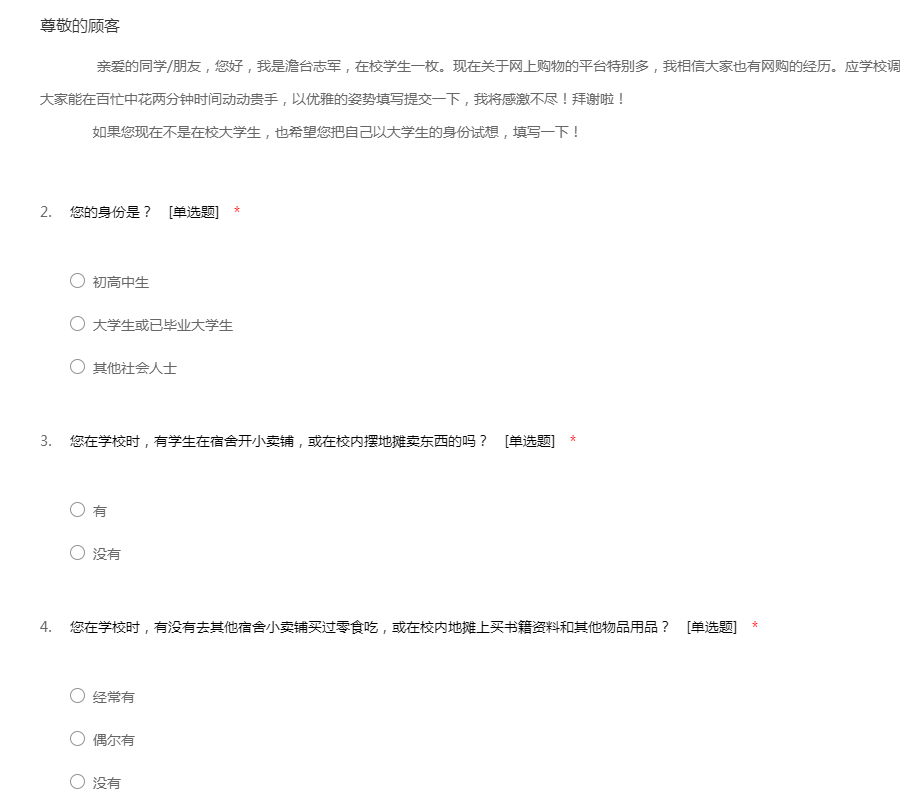 亲爱的同学/朋友,您好,我是澹台志军,在校学生一枚。现在关于网上购物的平台特别多,我相信大家也有网购的经历。应学校调查需要,作此调查问卷,希望看到问卷的大家能在百忙中花两分钟时间动动贵手,以优雅的姿势填写提交一下,我将感激不尽!拜谢啦! 如果您现在不是在校大学生,也希望您把自己以大学生的身份试想,填写一下!