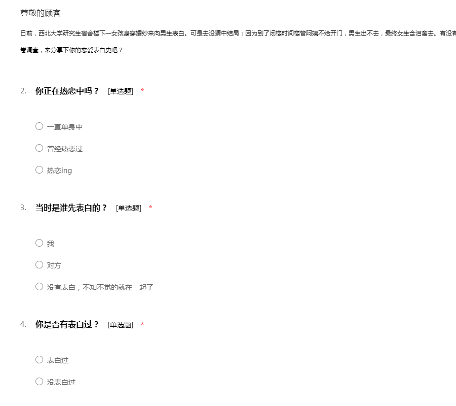 日前,西北大学研究生宿舍楼下一女孩身穿婚纱来向男生表白。可是去没猜中结局:因为到了闭楼时间楼管阿姨不给开门,男生出不去,最终女生含泪离去。有没有人已这种方式向你表白过呢?快来参与我们的问卷调查,来分享下你的恋爱表白史吧?