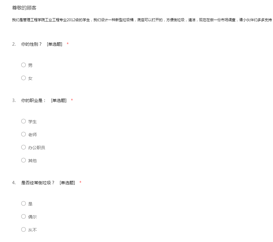 我们是管理工程学院工业工程专业2012级的学生,我们设计一种新型垃圾桶,底座可以打开的,方便倒垃圾,清洁,现在在做一份市场调查,请小伙伴们多多支持,谢谢。