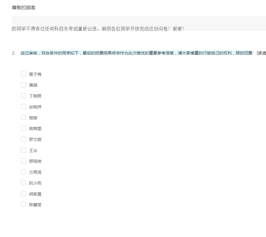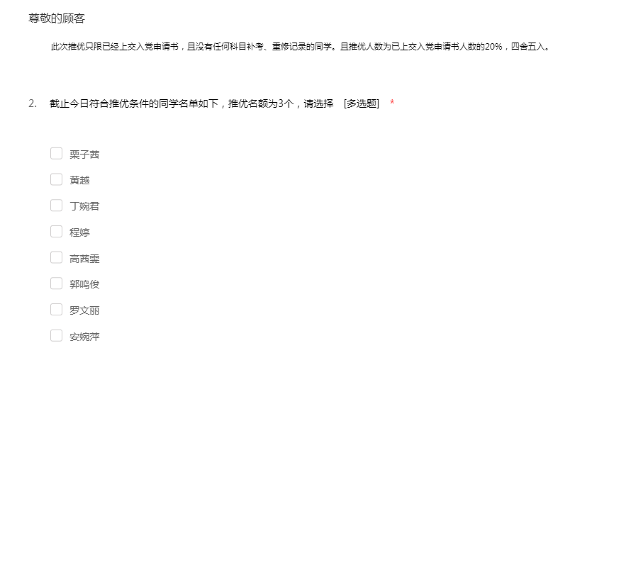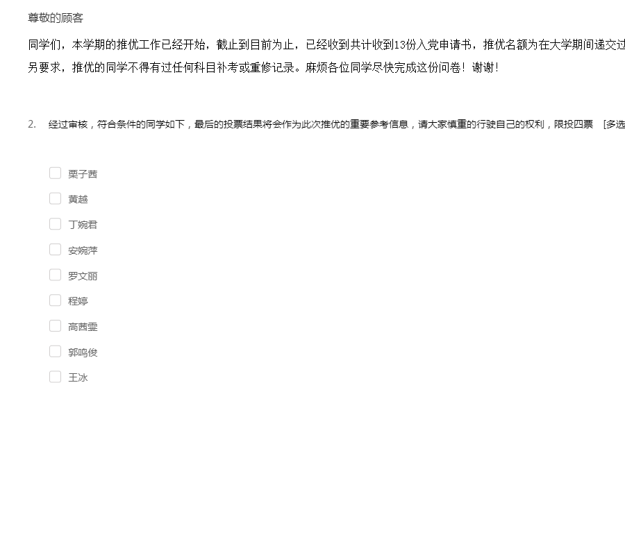 同学们,本学期的推优工作已经开始,到目前为止,共计收到13份入党申请书,推优名额为在大学期间递交过入党申请书人数的20%,四舍五入。另要求,推优的同学不得有过任何科目补考或重修记录。麻烦各位同学尽快完成这份问卷!谢谢!