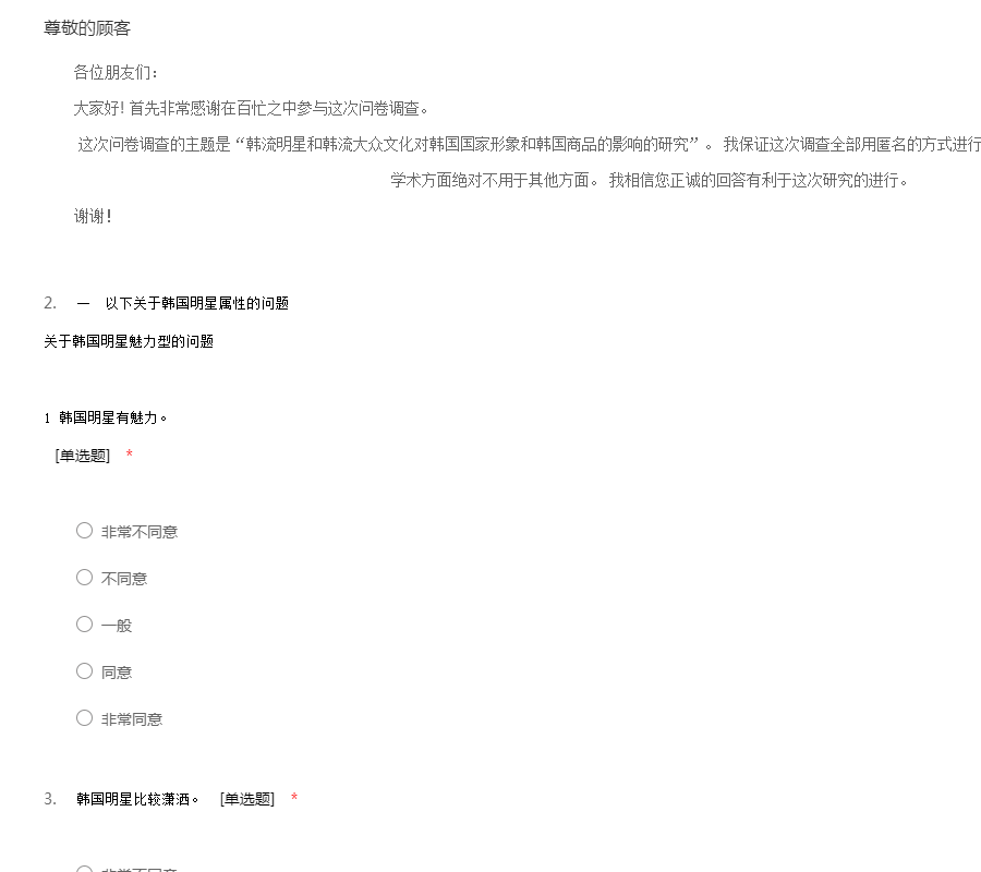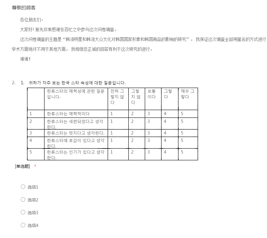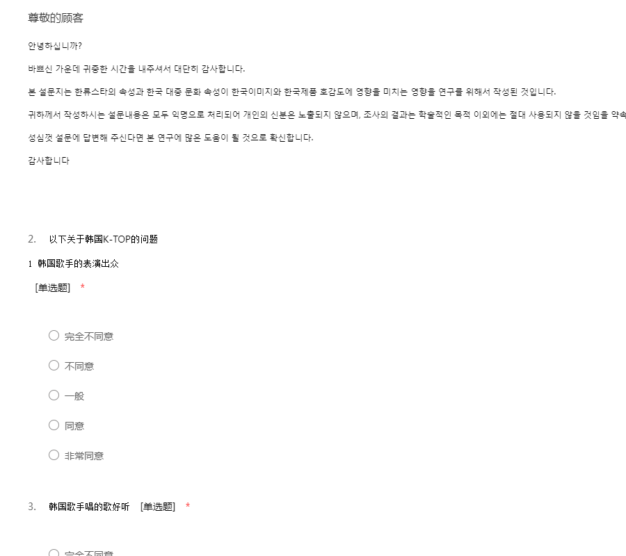 본 설문지는 한류스타의 속성과 한국 대중 문화 속성이 한국이미지와 한국제품 호감도에 영향을 미치는 영향을 연구를 위해서 작성된 것입니다.