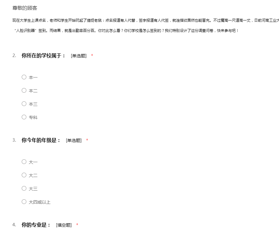 现在大学生上课点名,老师和学生开始玩起了猫捉老鼠:点名报道有人代替,签字报道有人代签,就连指纹居然也能冒充。不过魔高一尺道高一丈,日前河南工业大学新闻与传播学院播音专业的大学生们上课前用“人脸识别器”签到。而结果,就是出勤率百分百。你对此怎么看?你们学校是怎么签到的?我们特别设计了这份调查问卷,快来参与吧!