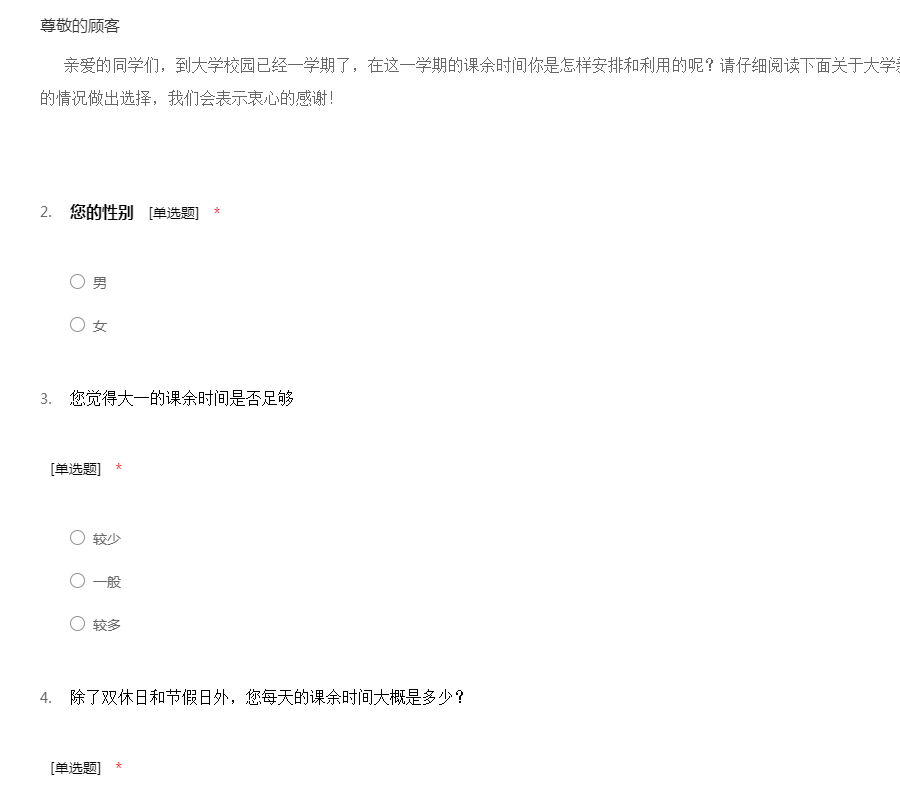 亲爱的同学们,到大学校园已经一学期了,在这一学期的课余时间你是怎样安排和利用的呢?请仔细阅读下面关于大学新生课余时间利用的问题,根据自己的情况做出选择,我们会表示衷心的感谢!