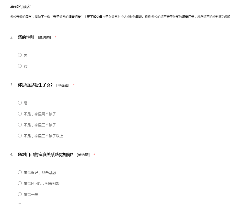 各位亲爱的同学,我做了一份“亲子关系的调查问卷”主要了解父母与子女关系对个人成长的影响。谢谢各位的填写亲子关系的调查问卷,您所填写的资料将为您保密。请放心!