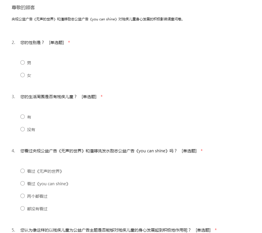 央视公益广告《无声的世界》和潘婷励志公益广告《you can shine》对残疾儿童身心发展的积极影响调查问卷。