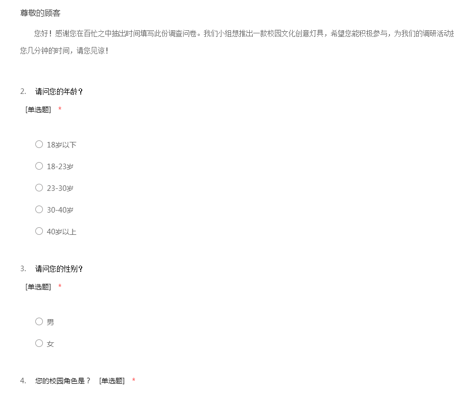您好!感谢您在百忙之中抽出时间填写此份调查问卷。我们小组想推出一款校园文化创意灯具,希望您能积极参与,为我们的调研活动提供宝贵的参考意见。本次调查将会耽误您几分钟的时间,请您见谅!