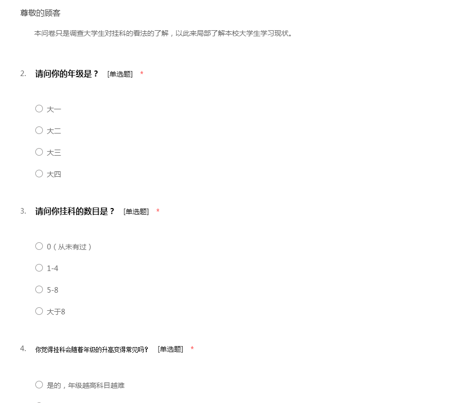 本问卷只是调查大学生对挂科的看法的了解,以此来局部了解本校大学生学习现状。