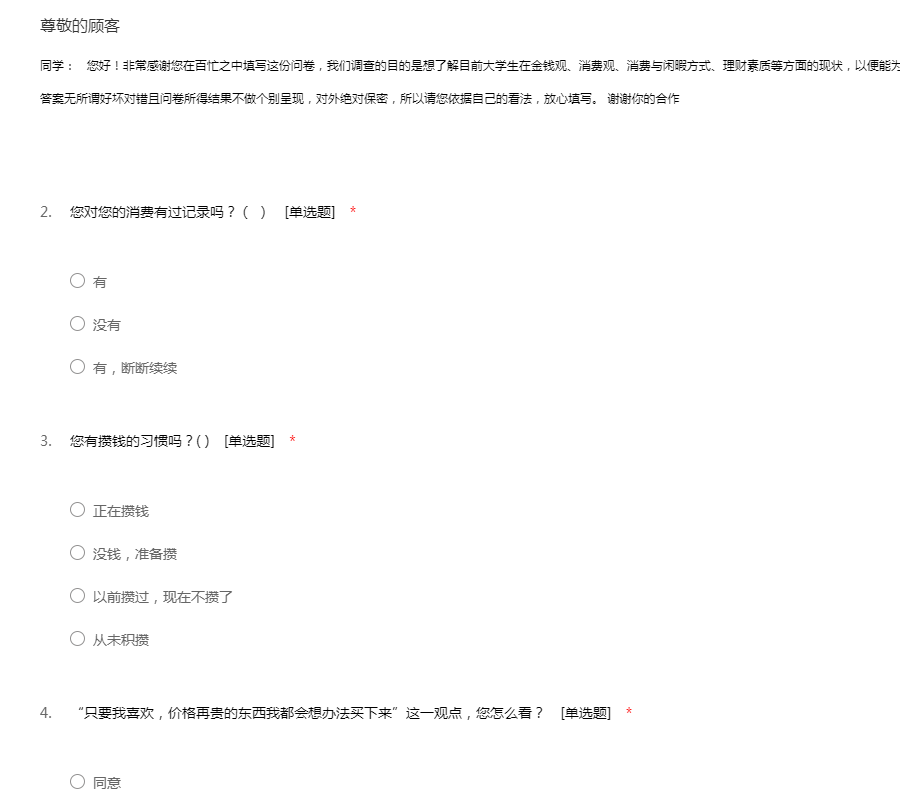 同学: 您好!非常感谢您在百忙之中填写这份问卷,我们调查的目的是想了解目前大学生在金钱观、消费观、消费与闲暇方式、理财素质等方面的现状,以便能为研究大学生时尚消费提供更多依据。本问卷各项答案无所谓好坏对错且问卷所得结果不做个别呈现,对外绝对保密,所以请您依据自己的看法,放心填写。 谢谢你的合作