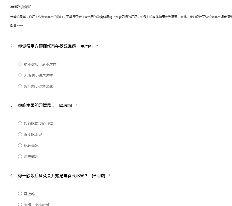 亲爱的同学,你好!作为大学生的你们,平常是否会注意自己的饮食健康呢?饮食习惯的好坏,对我们的身体健康尤为重要。为此,我们设计了这份大学生调查问卷,以了解大学生们对饮食健康的情况。感谢你的配合~~~