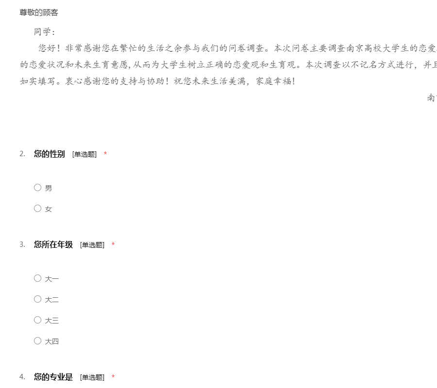 同学: 您好!非常感谢您在繁忙的生活之余参与我们的问卷调查。本次问卷主要调查南京高校大学生的恋爱观和生育观,用以分析大学生的恋爱状况和未来生育意愿,从而为大学生树立正确的恋爱观和生育观。本次调查以不记名方式进行,并且我们将对统计资料保密,请您如实填写。衷心感谢您的支持与协助!祝您未来生活美满,家庭幸福! 南京邮电大学人文与社会科学学院 2015年3月29日