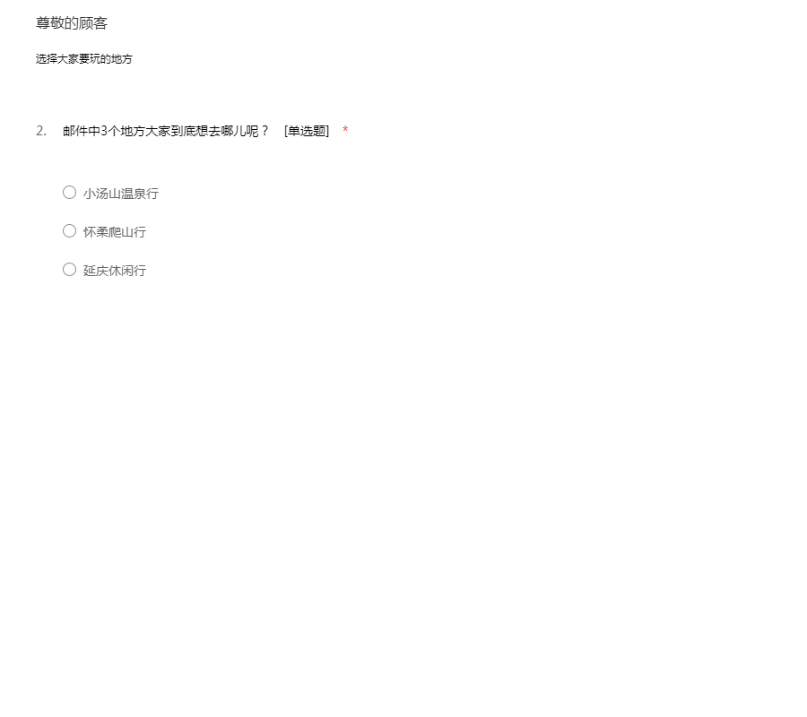 同学们,大家好!我们是10级旅游班的学生,为了进行课程实践活动,了解大家对于旅游的看 法,我们特意组织这次调查活动。我们将占用您两分钟的时间,希望您能根据自己真实的想法填写这份问卷,衷心的感谢大家的帮忙!