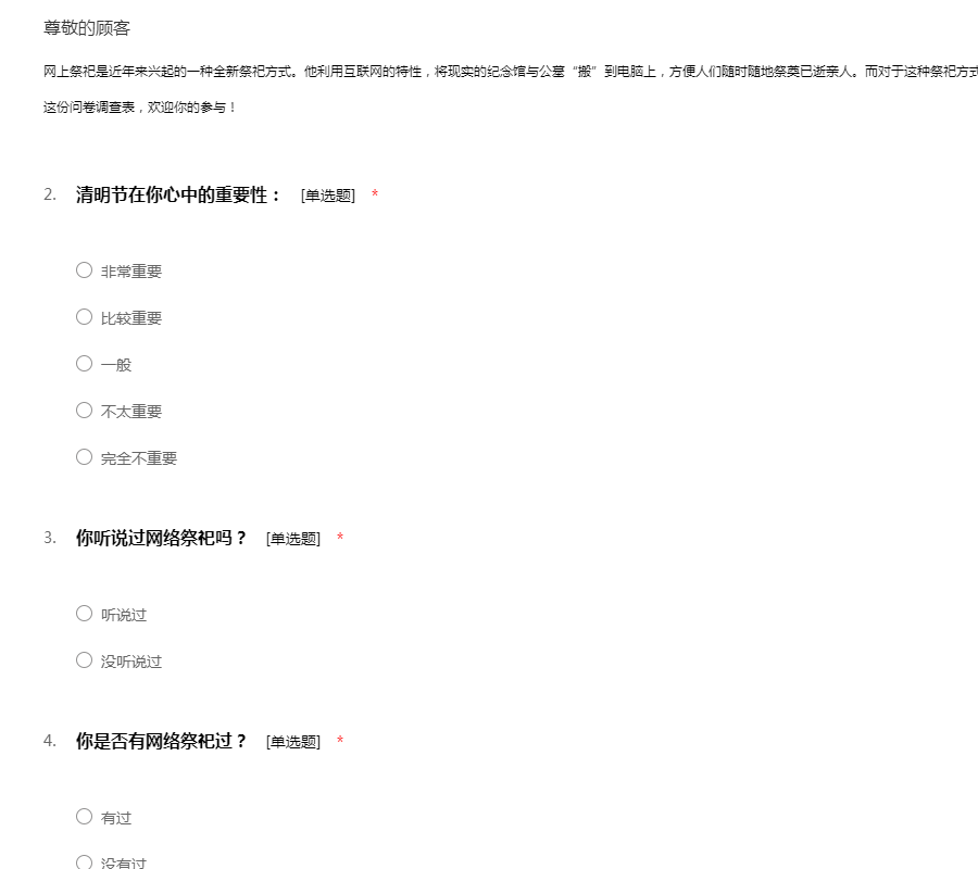 网上祭祀是近年来兴起的一种全新祭祀方式。他利用互联网的特性,将现实的纪念馆与公墓“搬”到电脑上,方便人们随时随地祭奠已逝亲人。而对于这种祭祀方式,你怎么看待呢?我们特此针对这一方面设计了这份问卷调查表,欢迎你的参与!