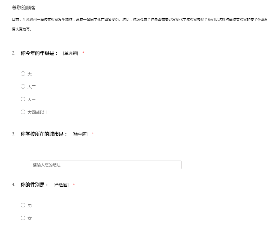 日前,江苏徐州一高校实验室发生爆炸,造成一名同学死亡四名受伤。对此,你怎么看?你是否需要经常到化学试验室去呢?我们此次针对高校实验室的安全性满意度进行调查,需要同学们的配合。问卷不记名,请认真填写。