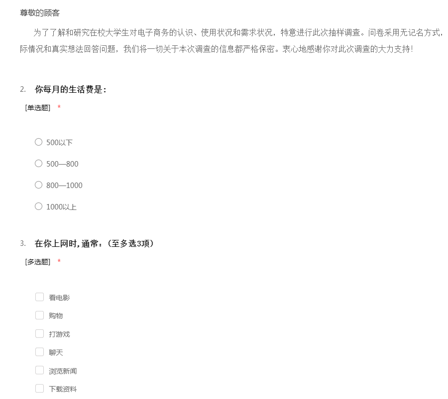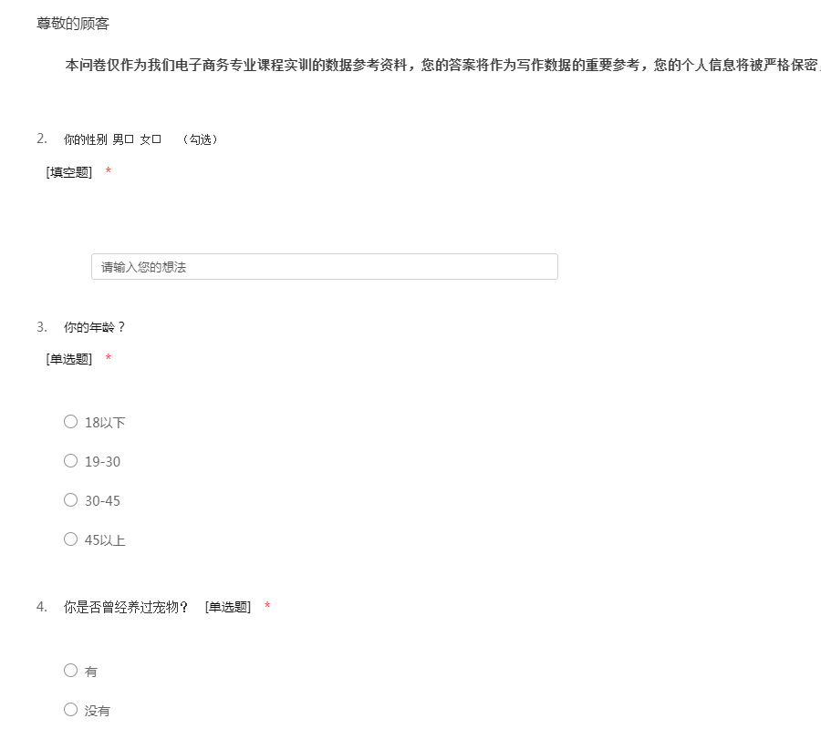 本问卷仅作为我们电子商务专业课程实训的数据参考资料,您的答案将作为写作数据的重要参考,您的个人信息将被严格保密,感谢您认真填写!