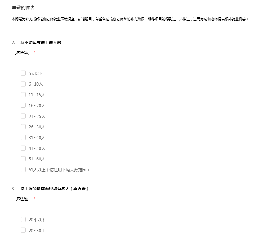 本问卷为补充成都瑜伽老师就业环境调查,新增题目,希望各位瑜伽老师帮忙补充数据!期待项目能得到进一步推进,进而为瑜伽老师提供额外就业机会!